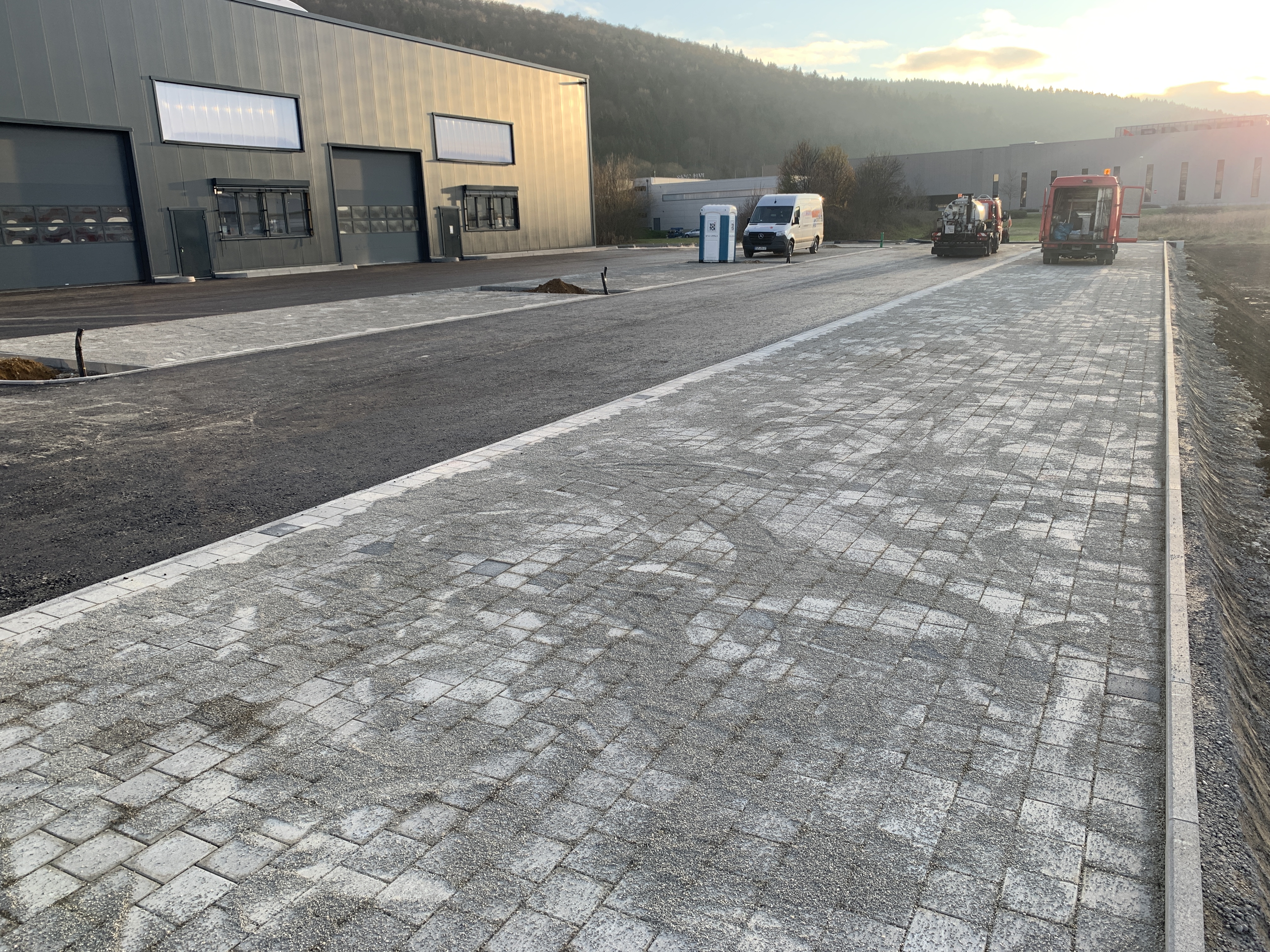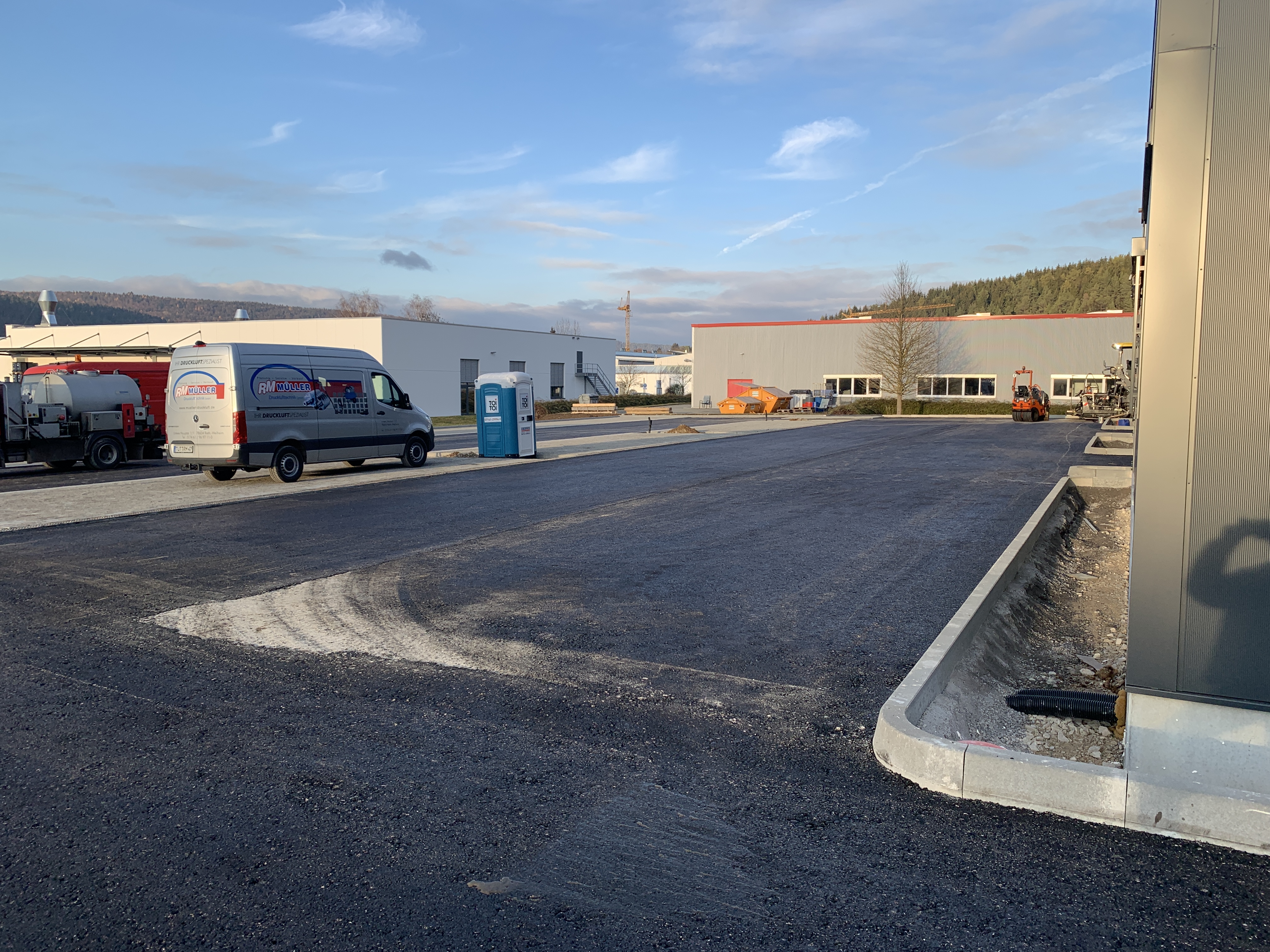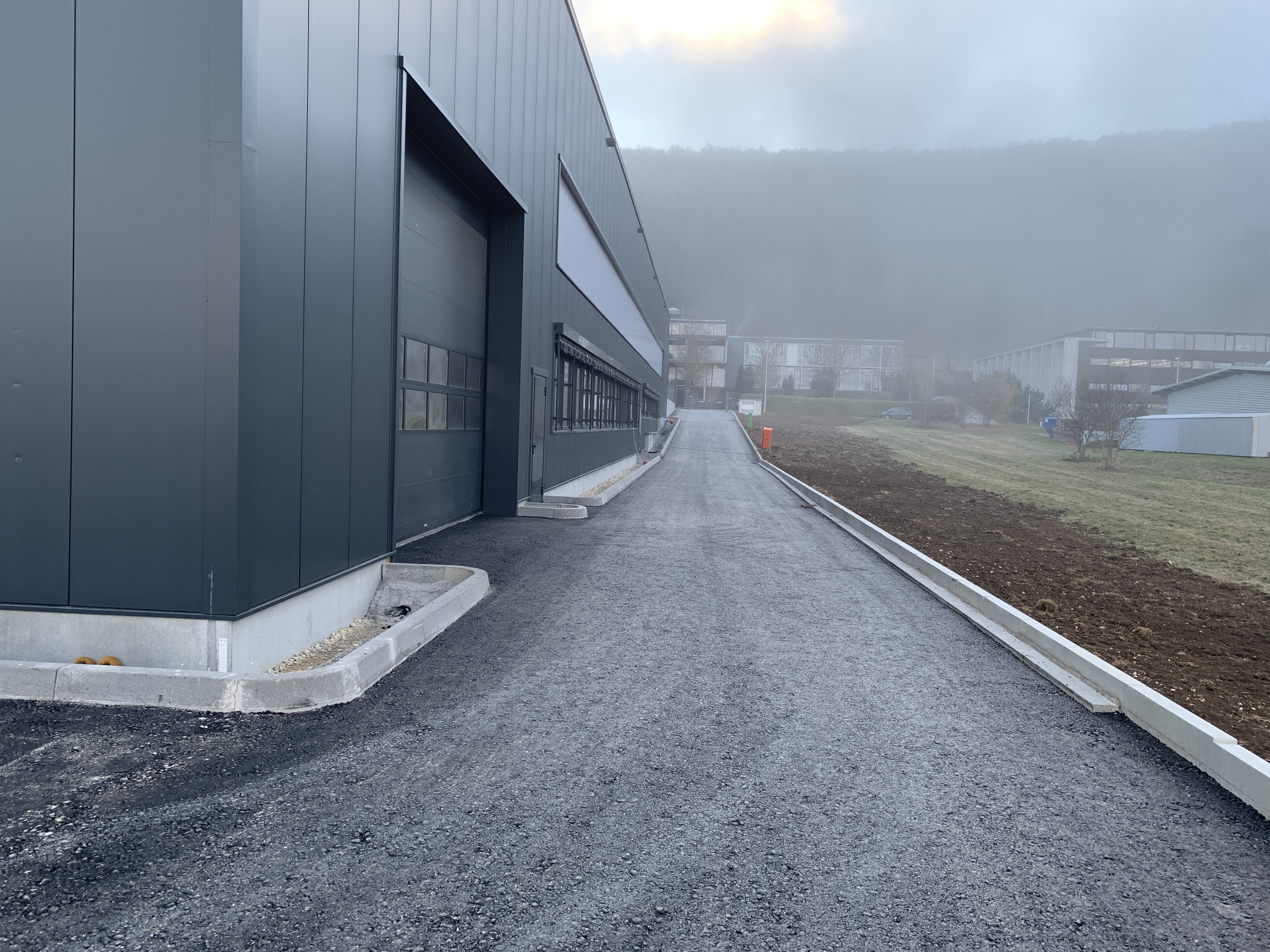 In der Außenanlage wurden die Parkplätze gepflastert und Bordsteine angebracht sowie die Zufahrten zum Produktionsgebäude asphaltiert. Auf dem Dach wird zudem zeitnah eine Photovoltaikanlage installiert.